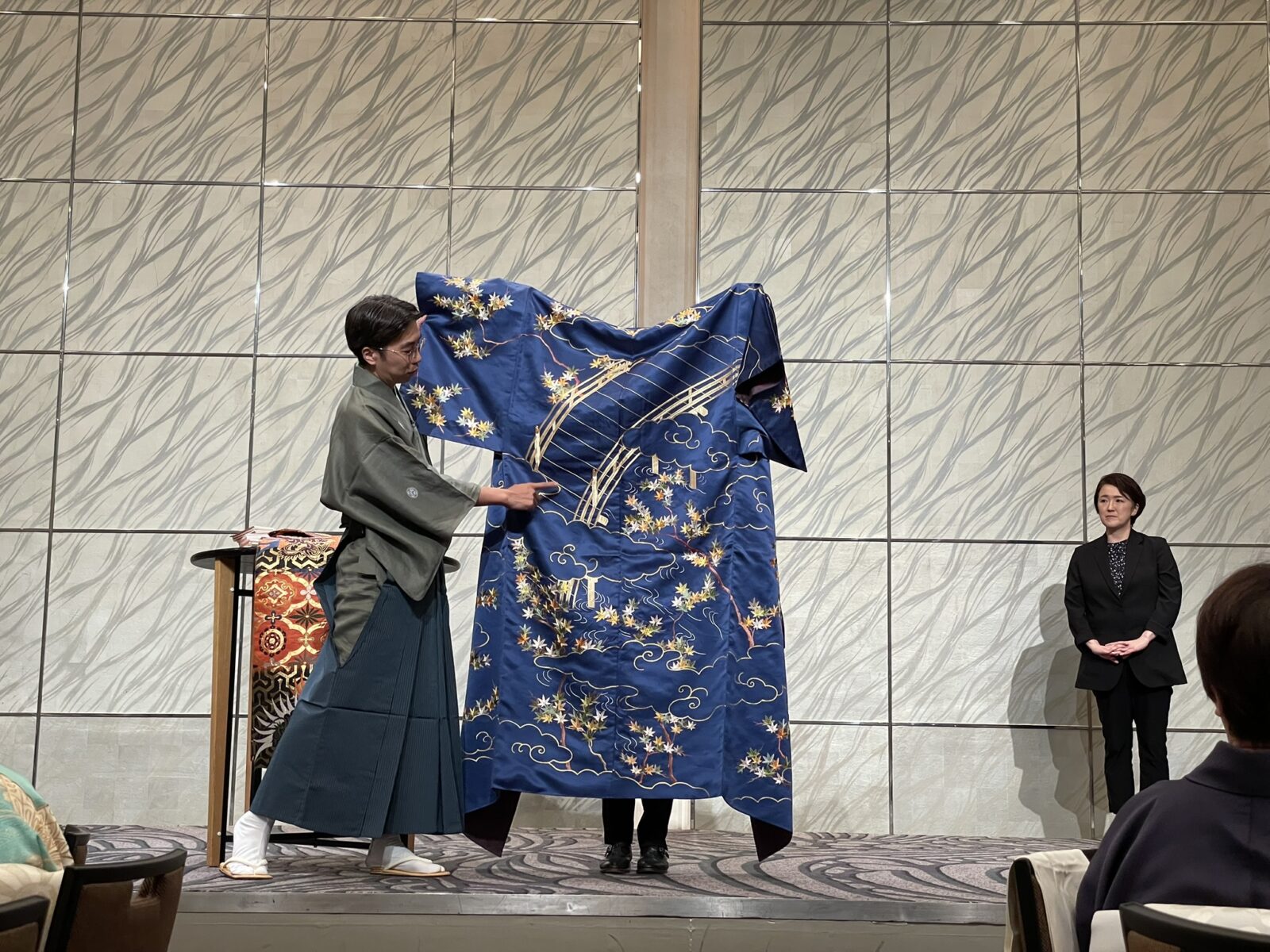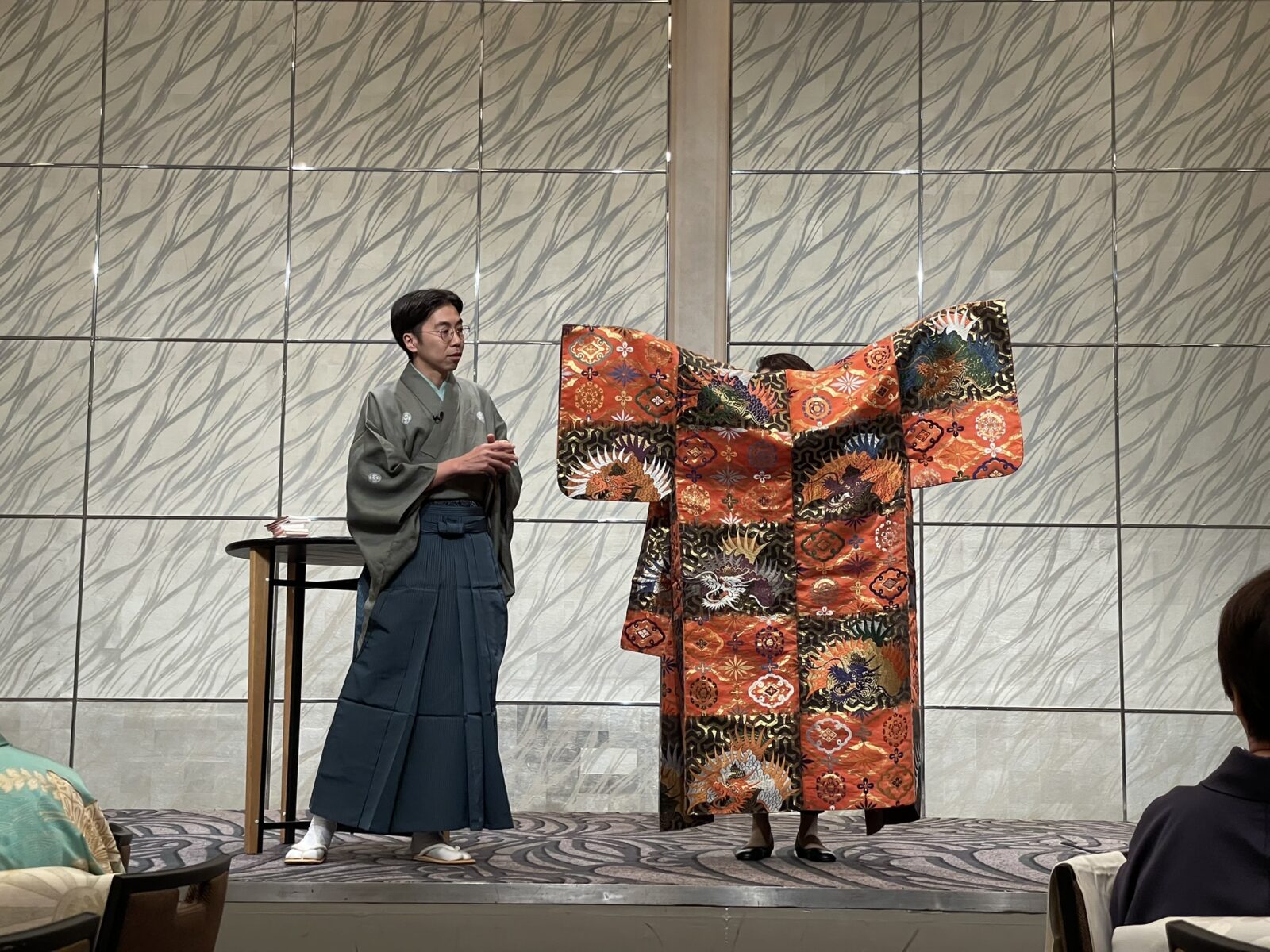 続いて、大蔵流狂言師・大藏教義先生による「狂言の装束」講演会が行われました。実はこの講演を楽しみにされていた方も多く、参加申込みが例年より早かったというお話も。先生のお話は期待通り大変興味深く、狂言の装束が文様や染色技法によって役柄や年齢を表現する重要な要素であること、また衣裳の手入れには独特の伝統があることを、実物を示しながらわかりやすく解説してくださいました。