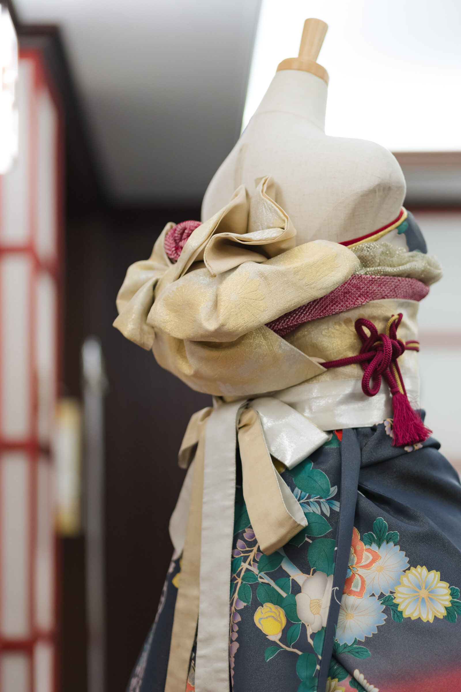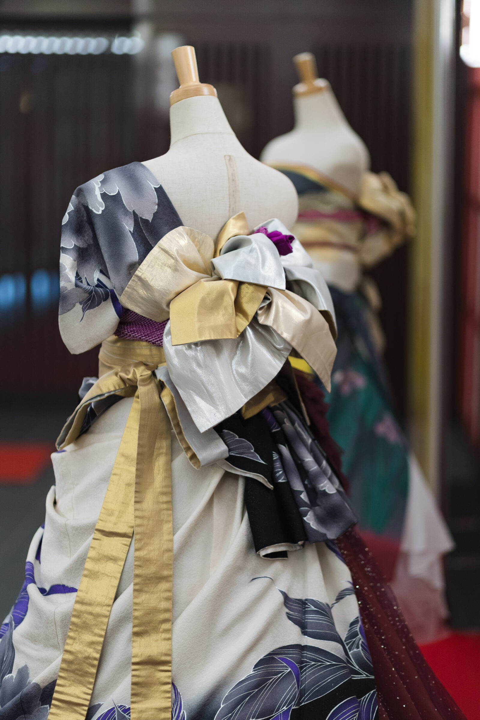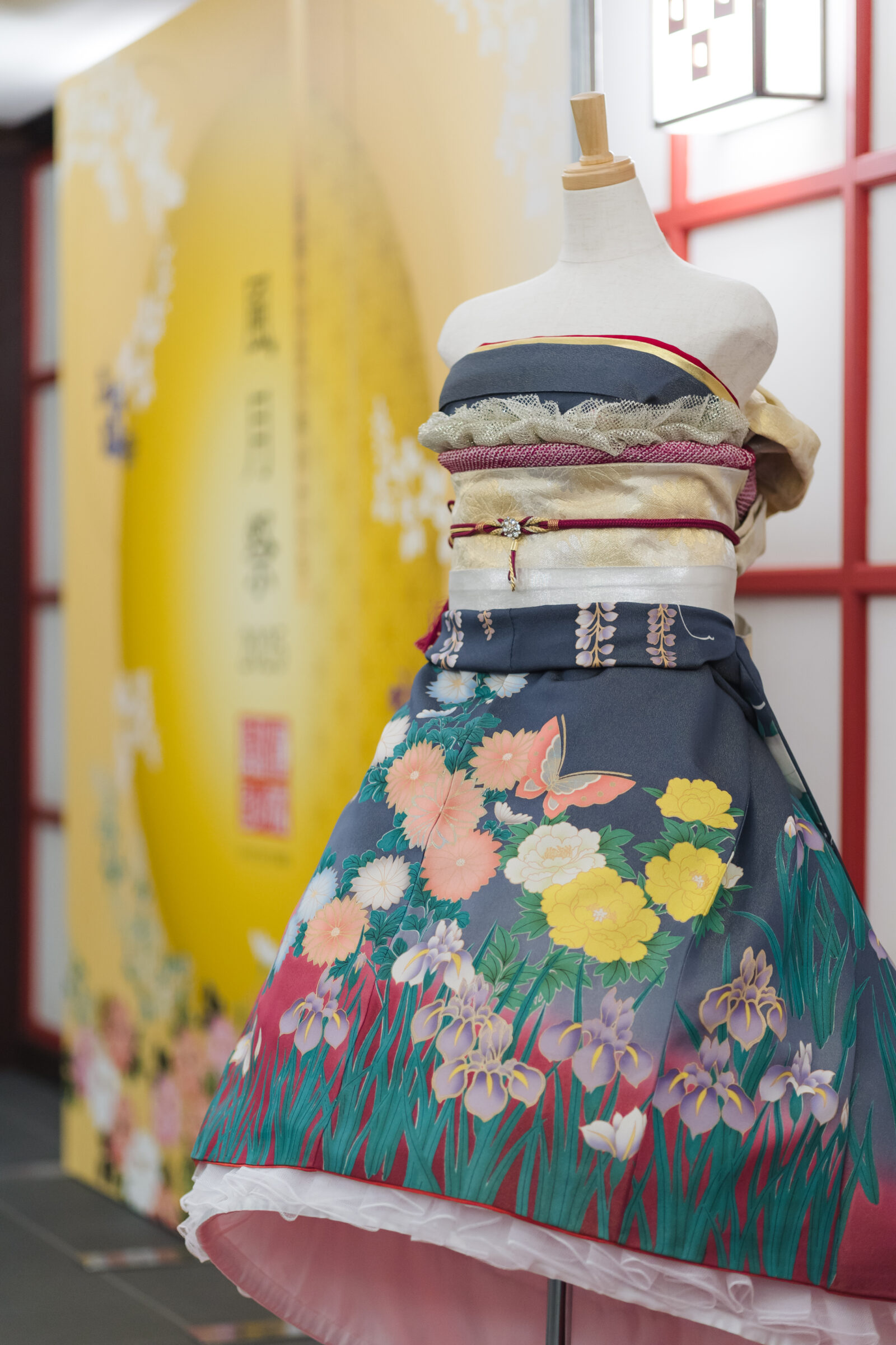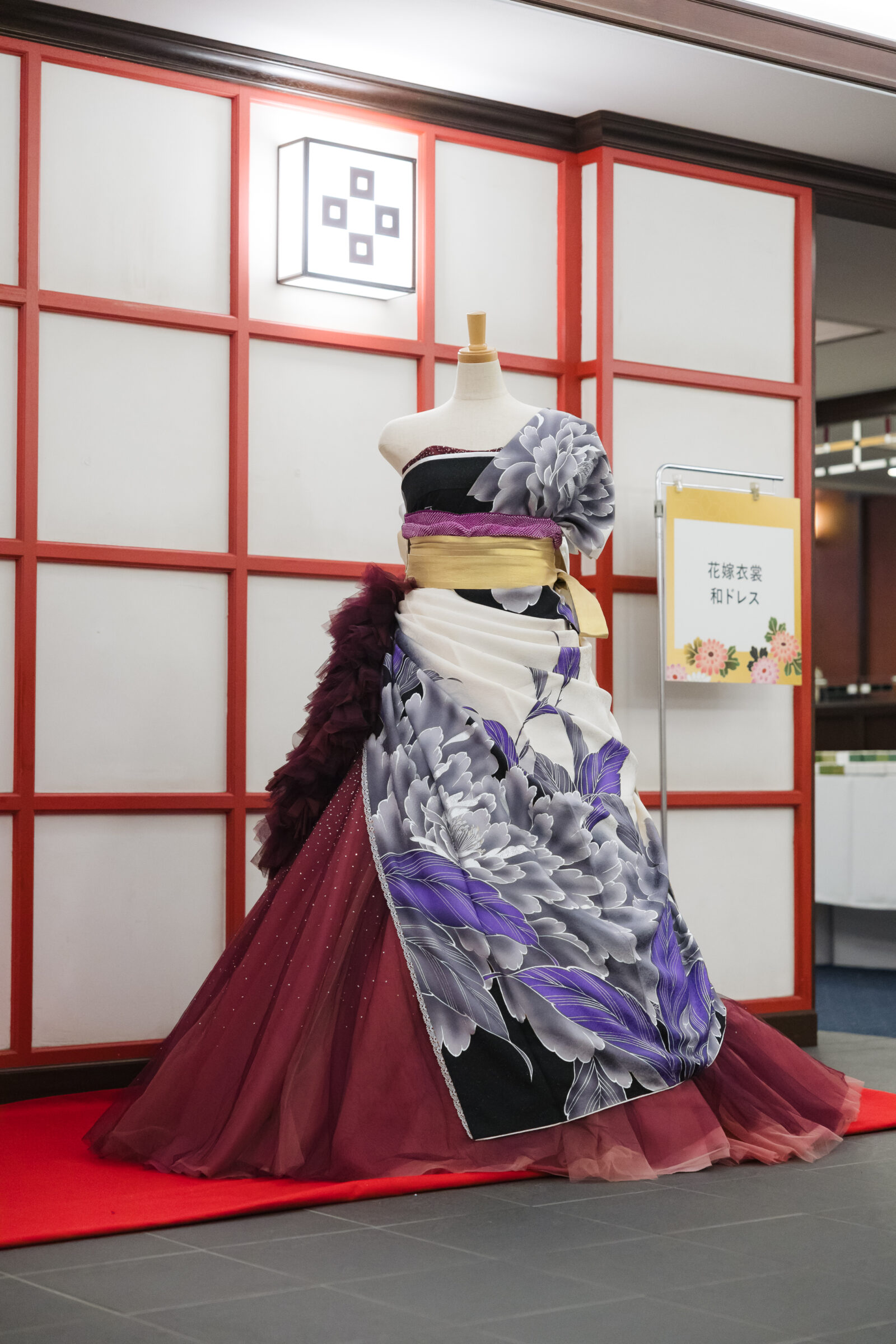 未来へ続く和のかたちをテーマにした今回の風月祭では振袖を着付け技術のみでドレスに着せ付ける和ドレス展示も