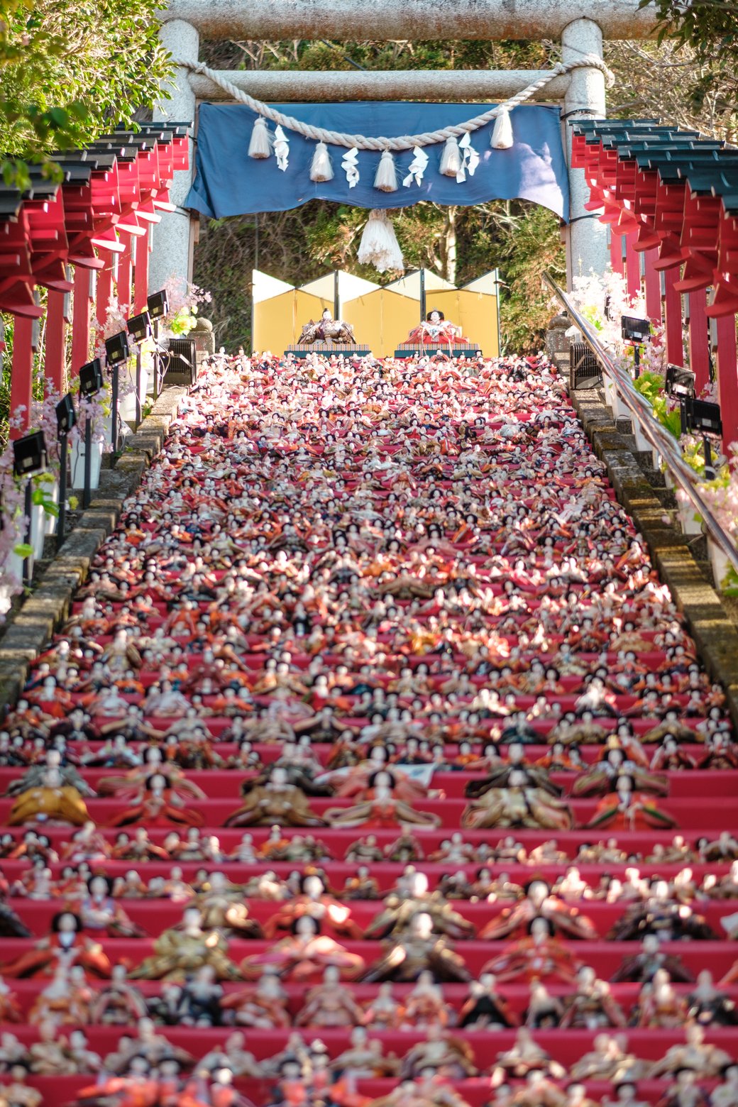 JR勝浦駅から徒歩約10分の遠見岬神社は必見スポット。石段に並ぶ雛人形は圧巻で、きものでの撮影にもぴったりです。