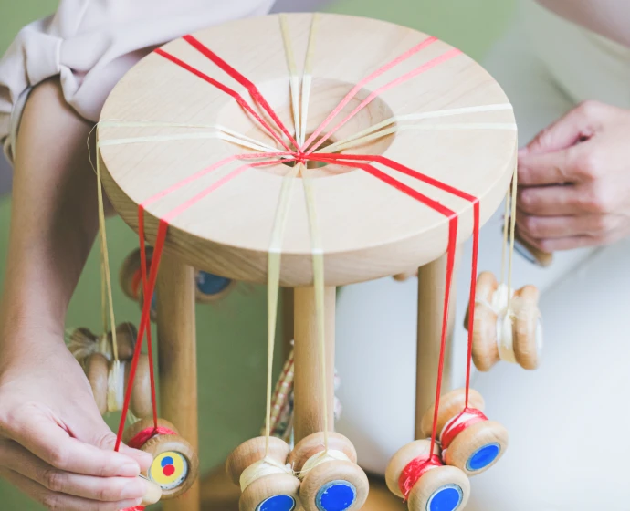 ワークショップでは、組紐道具の中でも最もコンパクトで万能な「丸台」を使用します。
