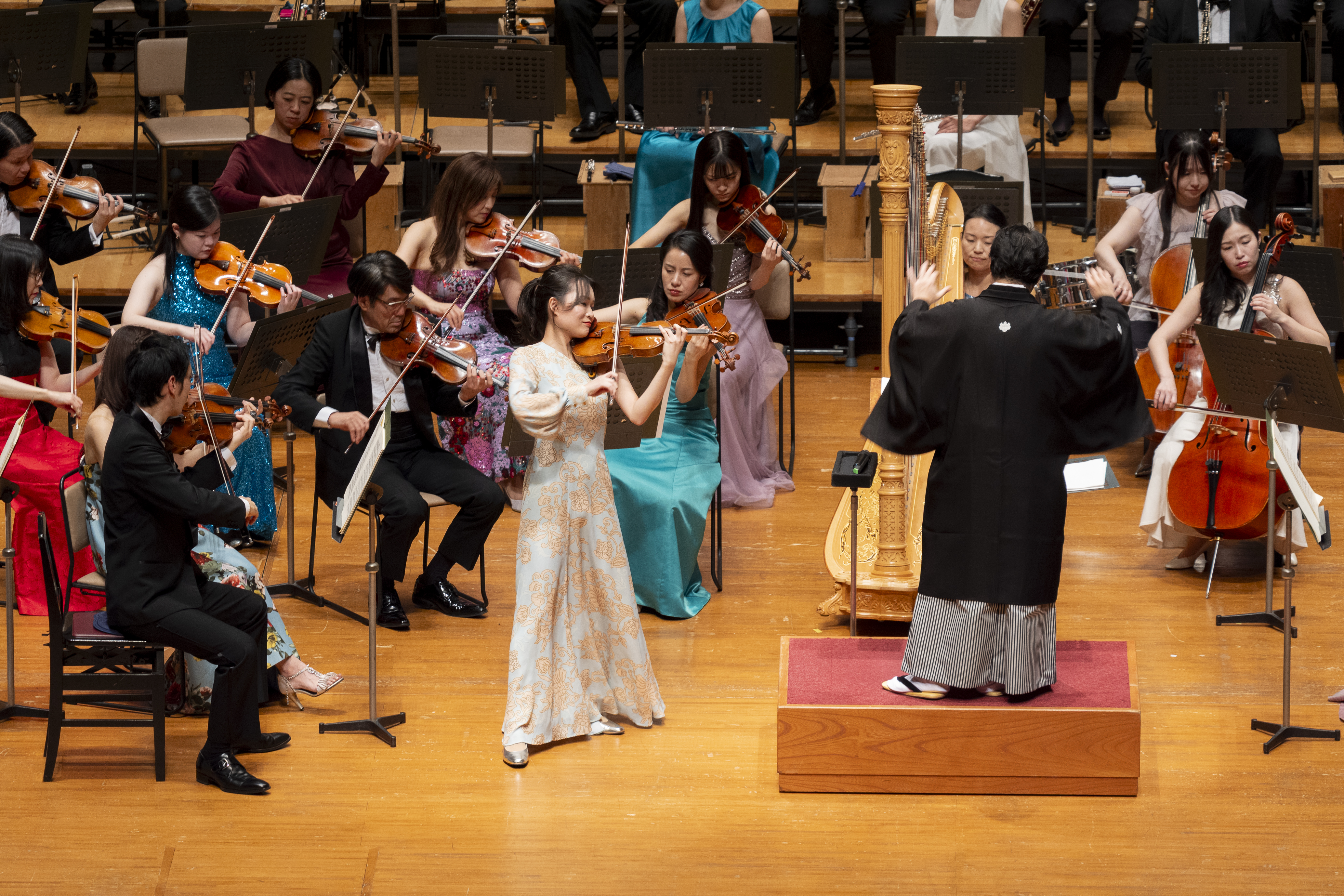 今回提供した衣装は指揮者・和田一樹様が着用した黒紋付羽織袴、ヴァイオリニスト・辻彩奈様の振袖、ピアニスト天野薫様の小振袖とスタッフの皆様の振袖、訪問着。色とりどりのきものが会場を華やかに彩りました。
